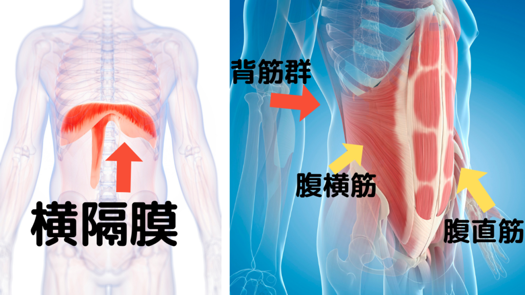 「反射」と表現されることが多いですが、ジャンプの瞬間にふっと息を止めて横隔膜を収縮させます。その瞬間に体幹の安定性にまつわる腹横筋、腹斜筋、背筋群などが連動的・反射的に収縮します。いわゆる体幹を固めている状態です。