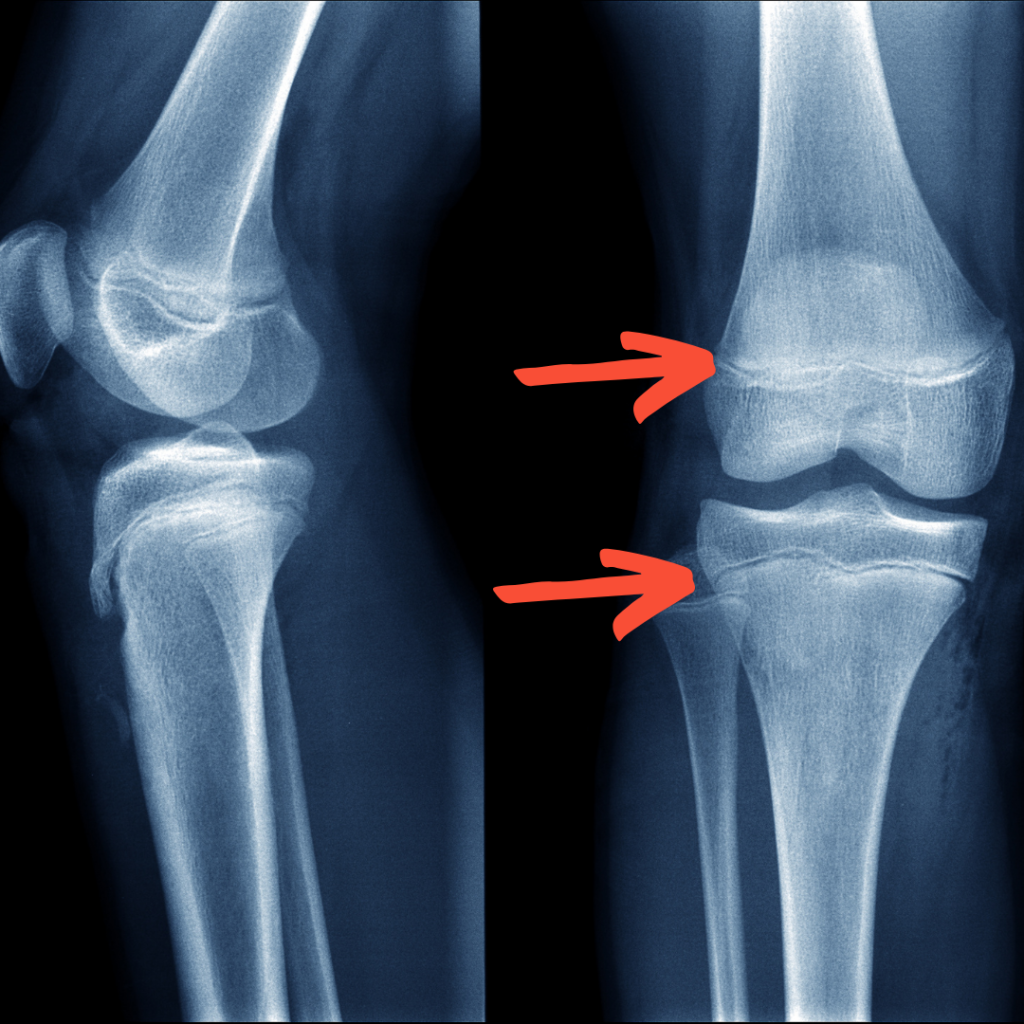 シーバー病はかかとの骨ですが、すねの骨や太ももの骨にも骨端線があります。この部分は構造的にその他の部分と比べて弱く、強い力がかかると容易に折れてしまいます。(写真はひざの骨)