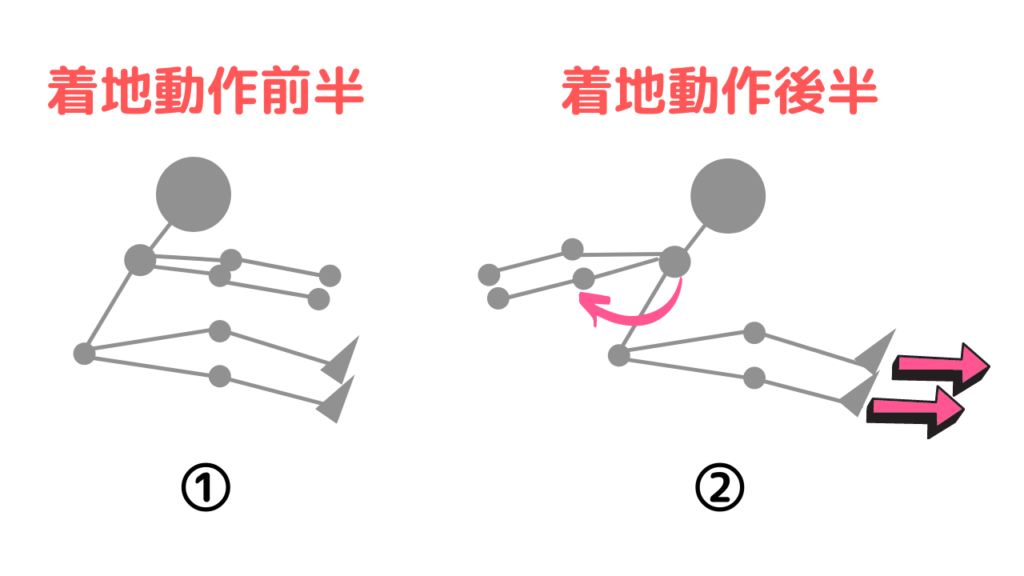 ②着地前半で前に投げ出した腕を自分の後方へ振り出す。同時にかかとを思い切り前方に突き出し少しでも前に着地できるように意識する。