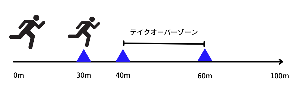 テイクオーバーゾーンは20mあります。その間で渡す必要があるのですが、ただ渡せればいいという訳ではありません。「スムーズ」に渡せているかが重要なので繰り返しの練習が必要になります。
